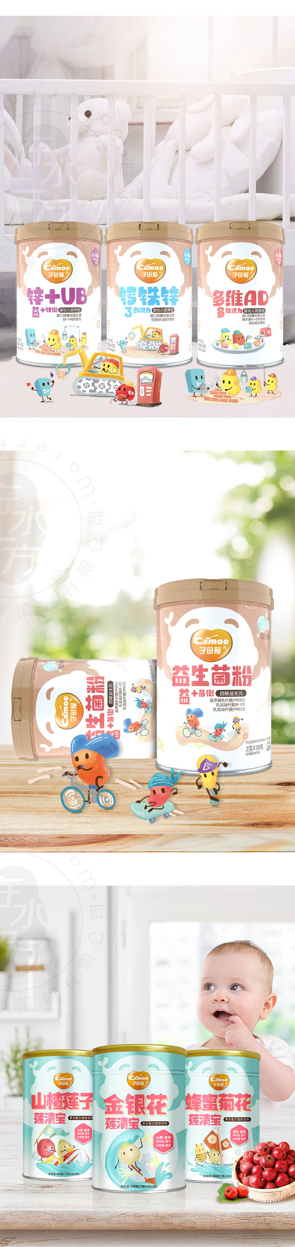 項目方案:子母愛品牌圍繞嬰童輔食營養(yǎng)品領域打造有情感有品質有親和力的品牌形象,迎合當前年輕消費市場的審美和體驗需求,用原創(chuàng)性手繪風格增加產品訴求力,提升陳列效果的同時也有助于品牌口碑和營銷的推進。