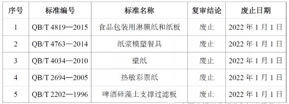 工業(yè)和信息化部2020年12月31日發(fā)布公告(中華人民共和國工業(yè)和信息化部公告2020年第51號(hào)),公告了一批行業(yè)標(biāo)準(zhǔn)的復(fù)審結(jié)論。其中,QB/T 4819—2015《食品包裝用淋膜紙和紙板》等五項(xiàng)造紙行業(yè)標(biāo)準(zhǔn)予以廢止,廢止日期均為2022年1月1日。具體情況如下: