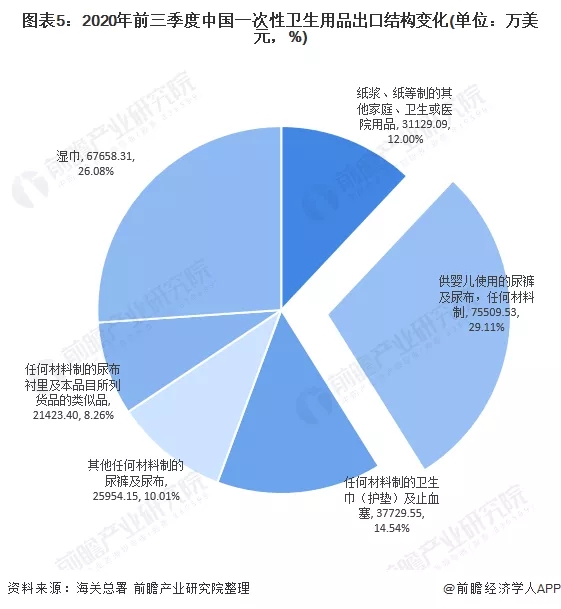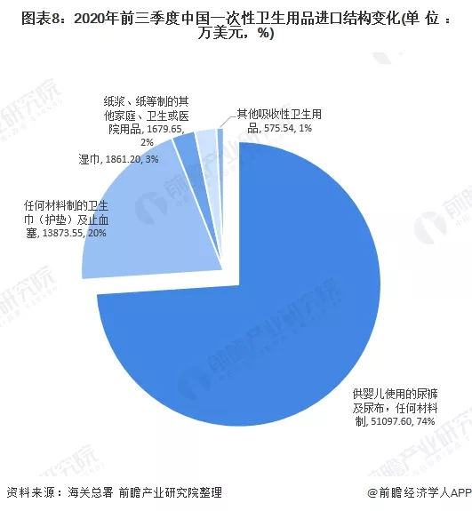 由于一次性衛(wèi)生用品種類繁多,大致分為吸收性衛(wèi)生用品和濕巾,在進出口中,吸收性衛(wèi)生用品占據(jù)主要比重,達到82%的份額。