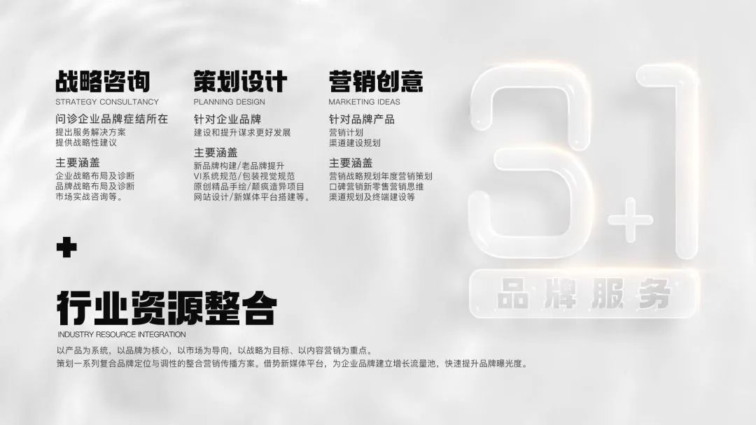 在一方品牌營(yíng)銷(xiāo)管理堅(jiān)持以品牌思維引領(lǐng)生活快消品行業(yè),致力于讓每個(gè)品牌更有價(jià)值,讓每個(gè)項(xiàng)目落到實(shí)處。“3+1品牌服務(wù)理念”精心打造戰(zhàn)略咨詢(xún)、策劃設(shè)計(jì)及營(yíng)銷(xiāo)創(chuàng)意三大核心板塊,加之整合行業(yè)產(chǎn)業(yè)鏈,以提供定制型全案服務(wù),驅(qū)動(dòng)品牌的市場(chǎng)價(jià)值,締造行業(yè)第一綜合型服務(wù)品牌!
