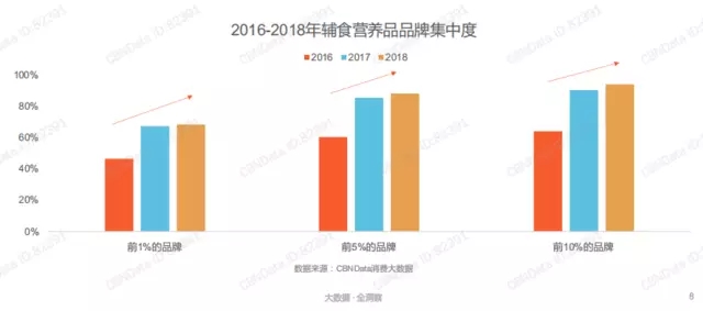 一直以來,嬰幼兒輔食營養(yǎng)品行業(yè)市場集中度都較高,頭部效應(yīng)比較凸顯。從上圖可以看出,2016年輔食營養(yǎng)品前1%的品牌銷售額占比低于半數(shù),發(fā)展至2017-2018年,輔食營養(yǎng)品前1%的品牌貢獻(xiàn)了超過6成以上的銷售額,前5%的品牌貢獻(xiàn)了八成左右的銷售額,前10%的品牌貢獻(xiàn)了接近90%的銷售額,且在逐年增強(qiáng)。品牌集中度持續(xù)趨高,頭部企業(yè)地位難以撼動(dòng)。